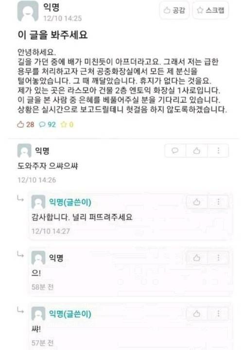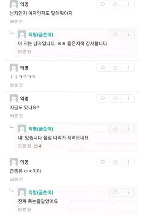 급똥이였던 대학생의 다급한 도움 요청 광명사람 (218.♡.64.250) 13 15635 31 1 2020.03.27 01:35 31 이전글 : 계속 가라앉던 희귀종 물고기 뱃속에 들어있던 것 다음글 : 조주빈, 이틀간 손석희 관련 진술만 반복