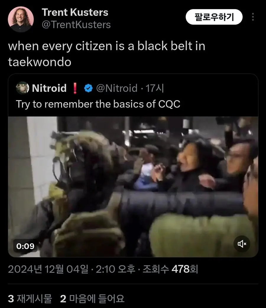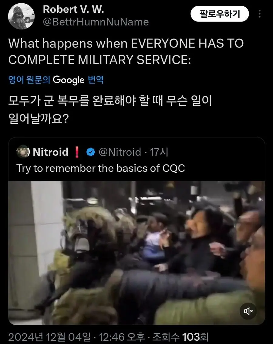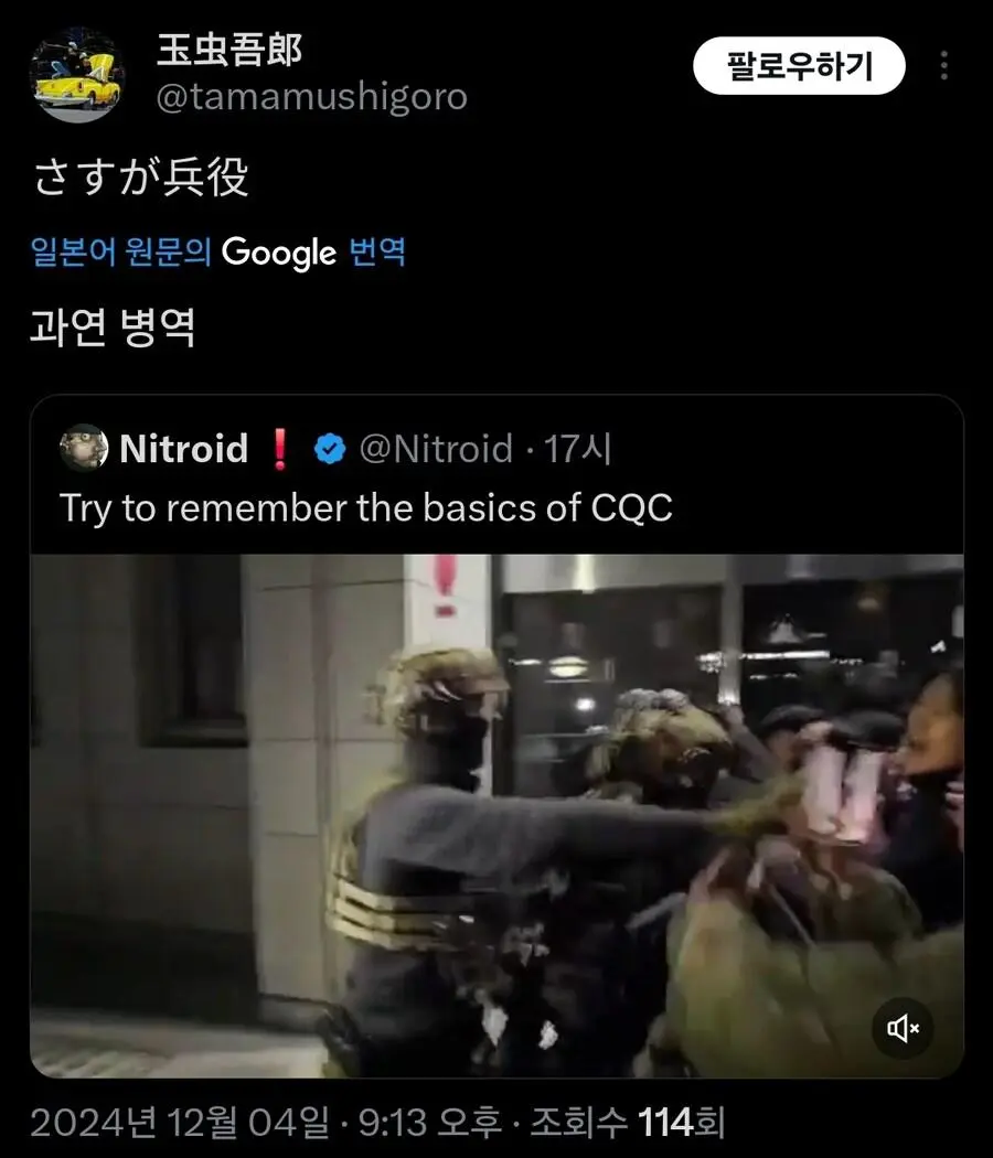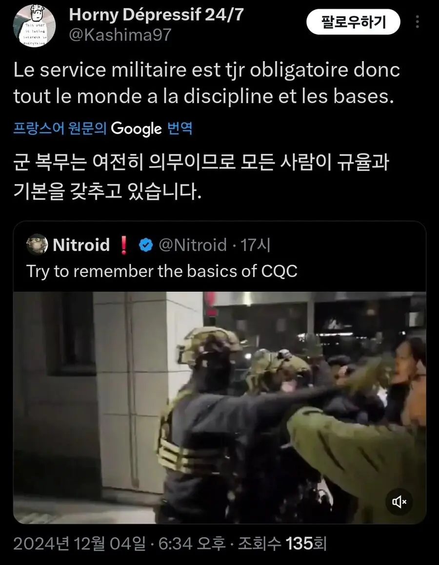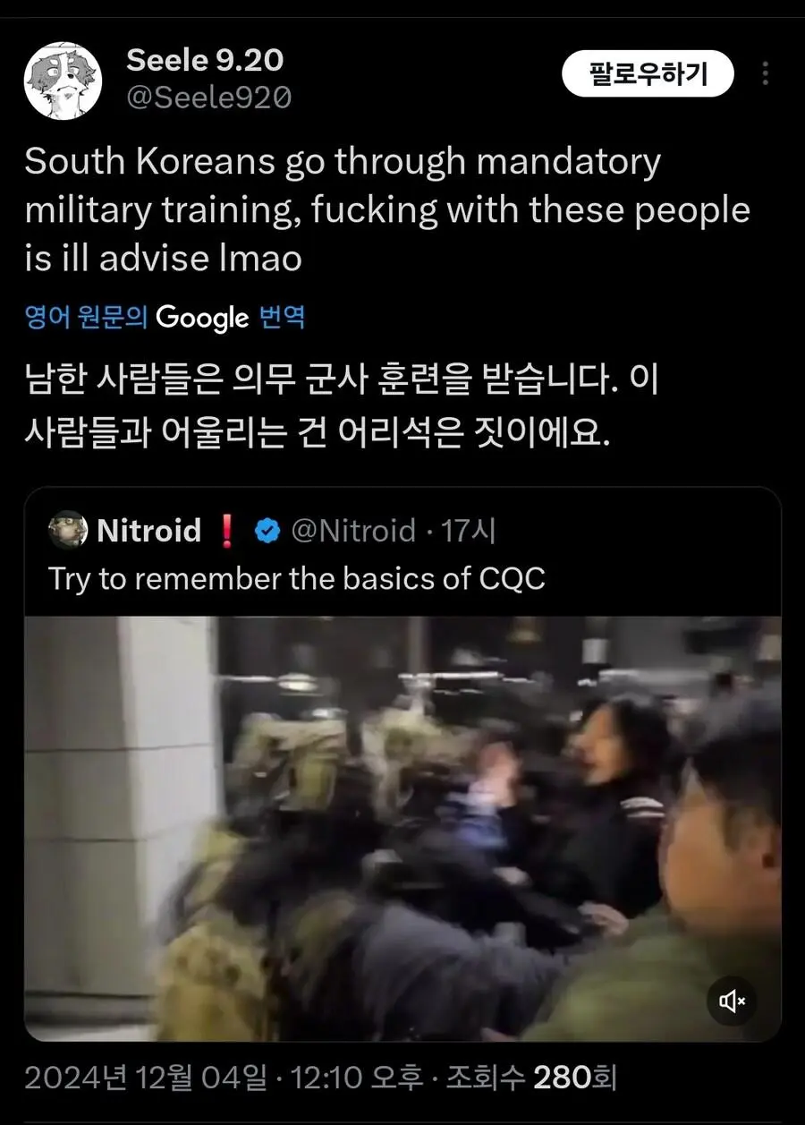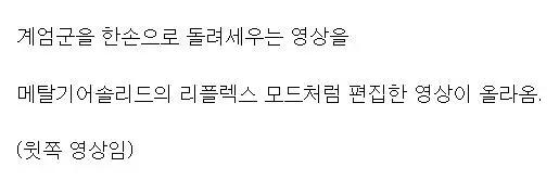 현재 외국에서 큰 화제가 되고 있는 기자의 군인 무력화 영상.mp4 웃는남자 (175.♡.37.12) 7 2465 2 0 2024.12.05 22:07 2 이전글 : 비비지 은하 만두머리 다음글 : 요즘 10대들에게 무섭게 퍼지고 있는 병.twt