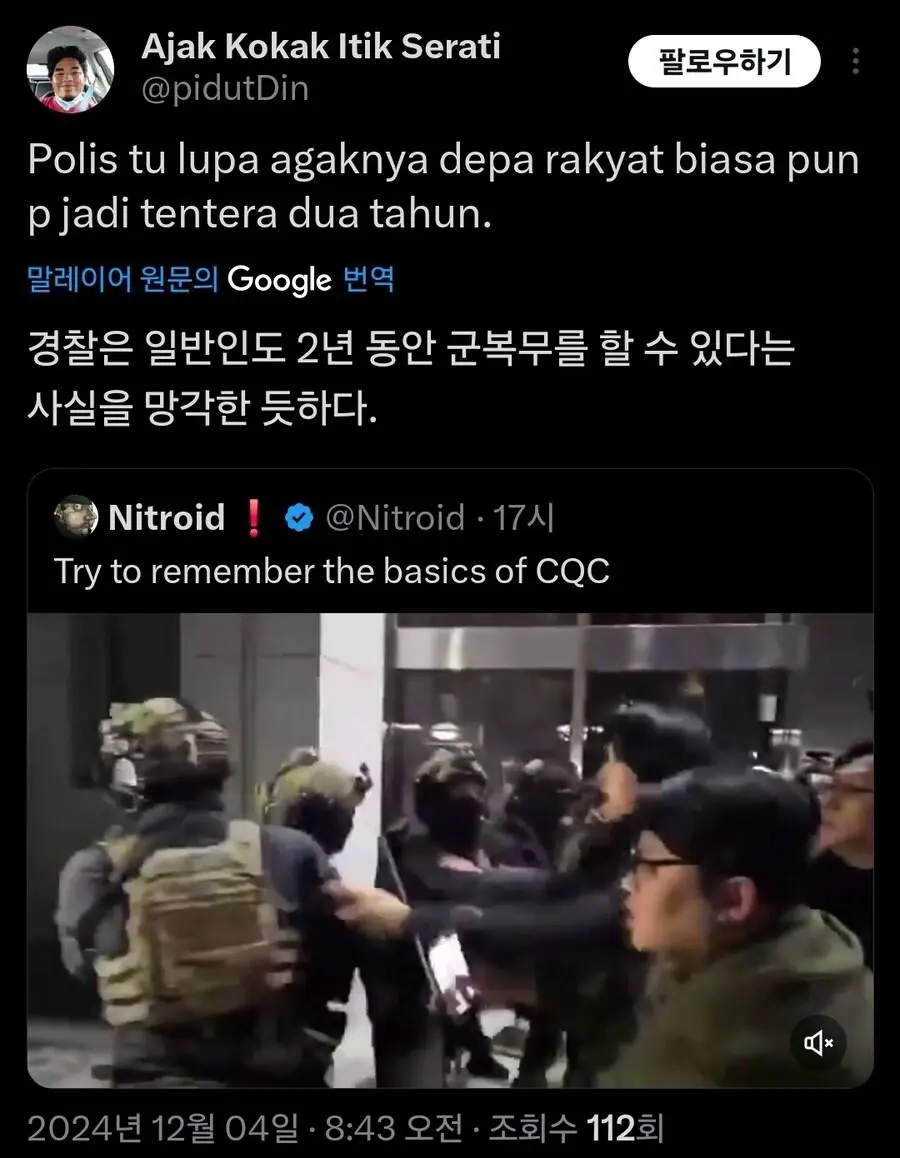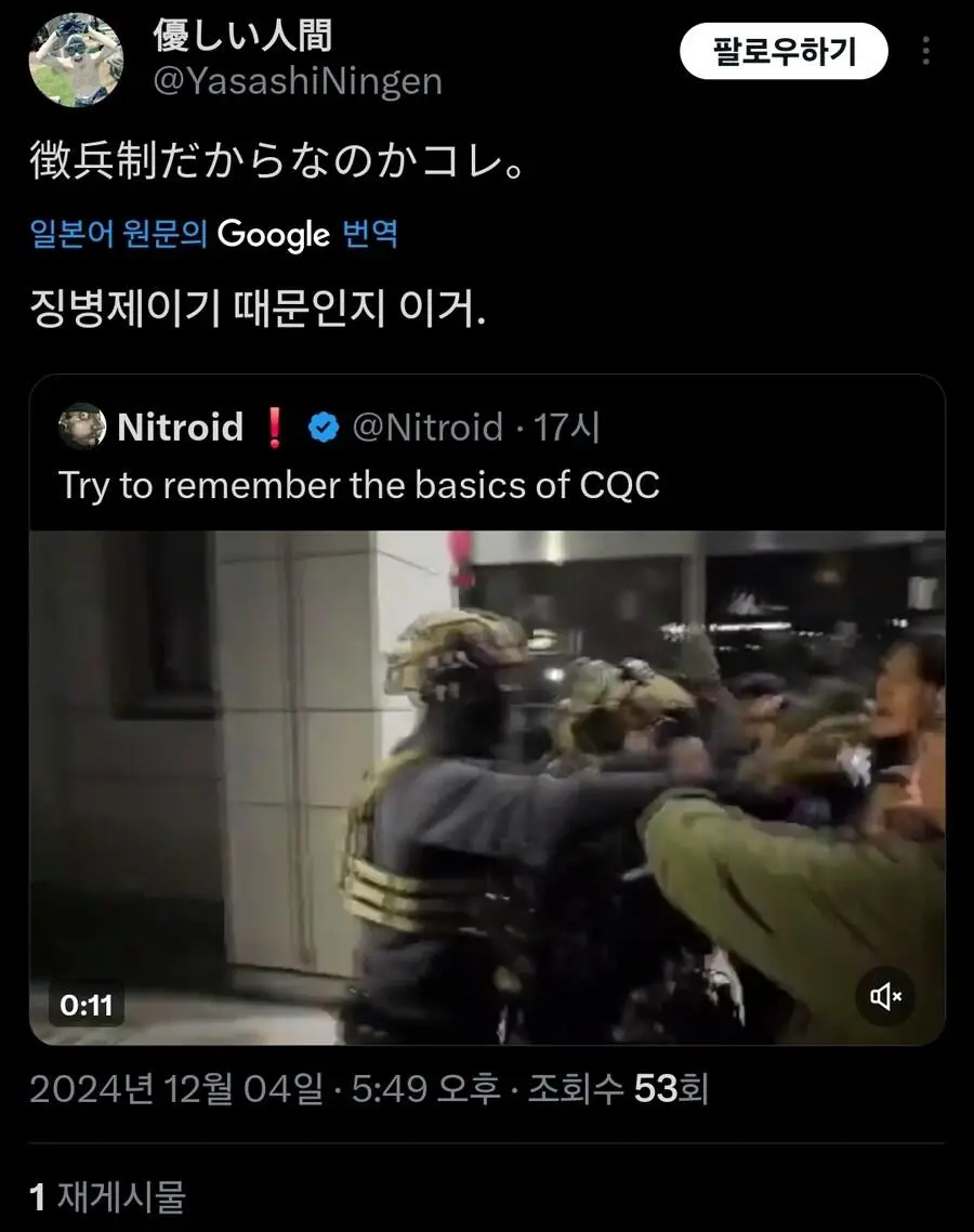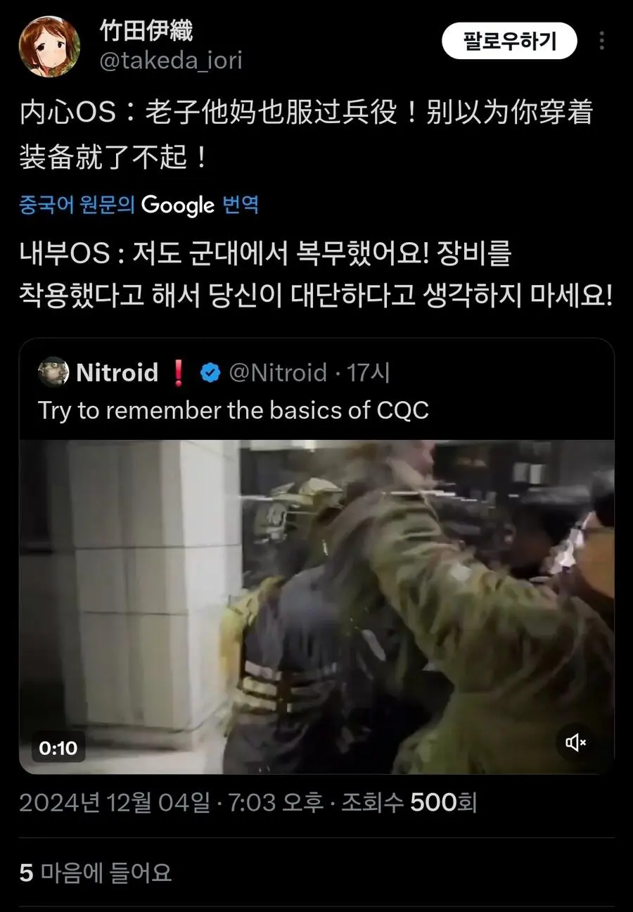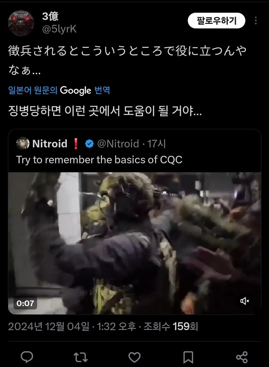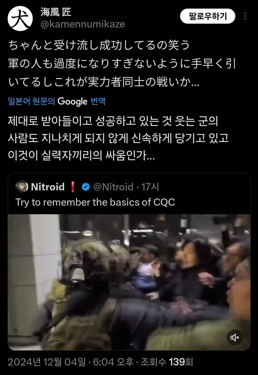 현재 외국에서 큰 화제가 되고 있는 기자의 군인 무력화 영상.mp4 웃는남자 (175.♡.37.12) 7 2465 2 0 2024.12.05 22:07 2 이전글 : 비비지 은하 만두머리 다음글 : 요즘 10대들에게 무섭게 퍼지고 있는 병.twt