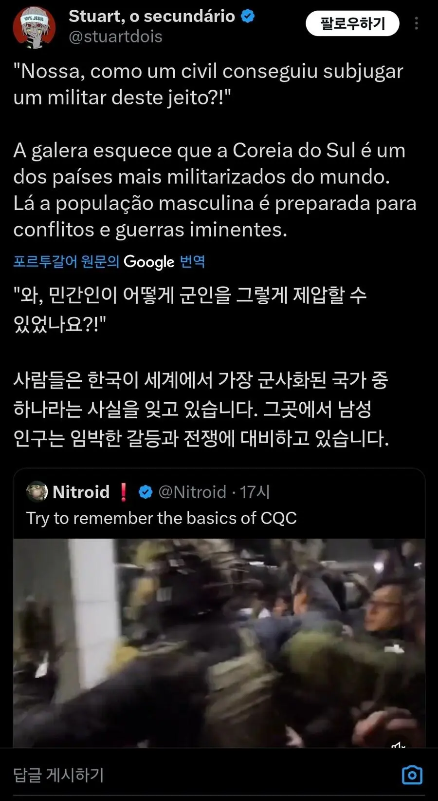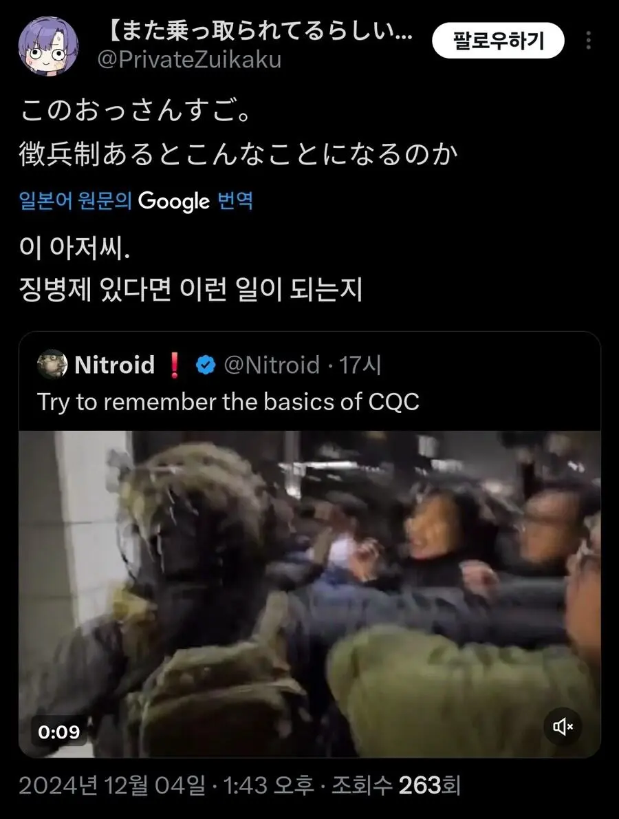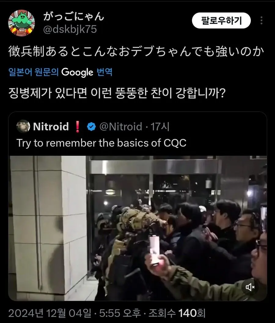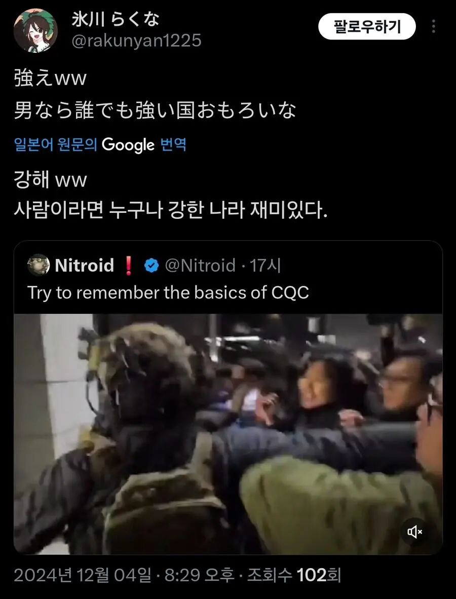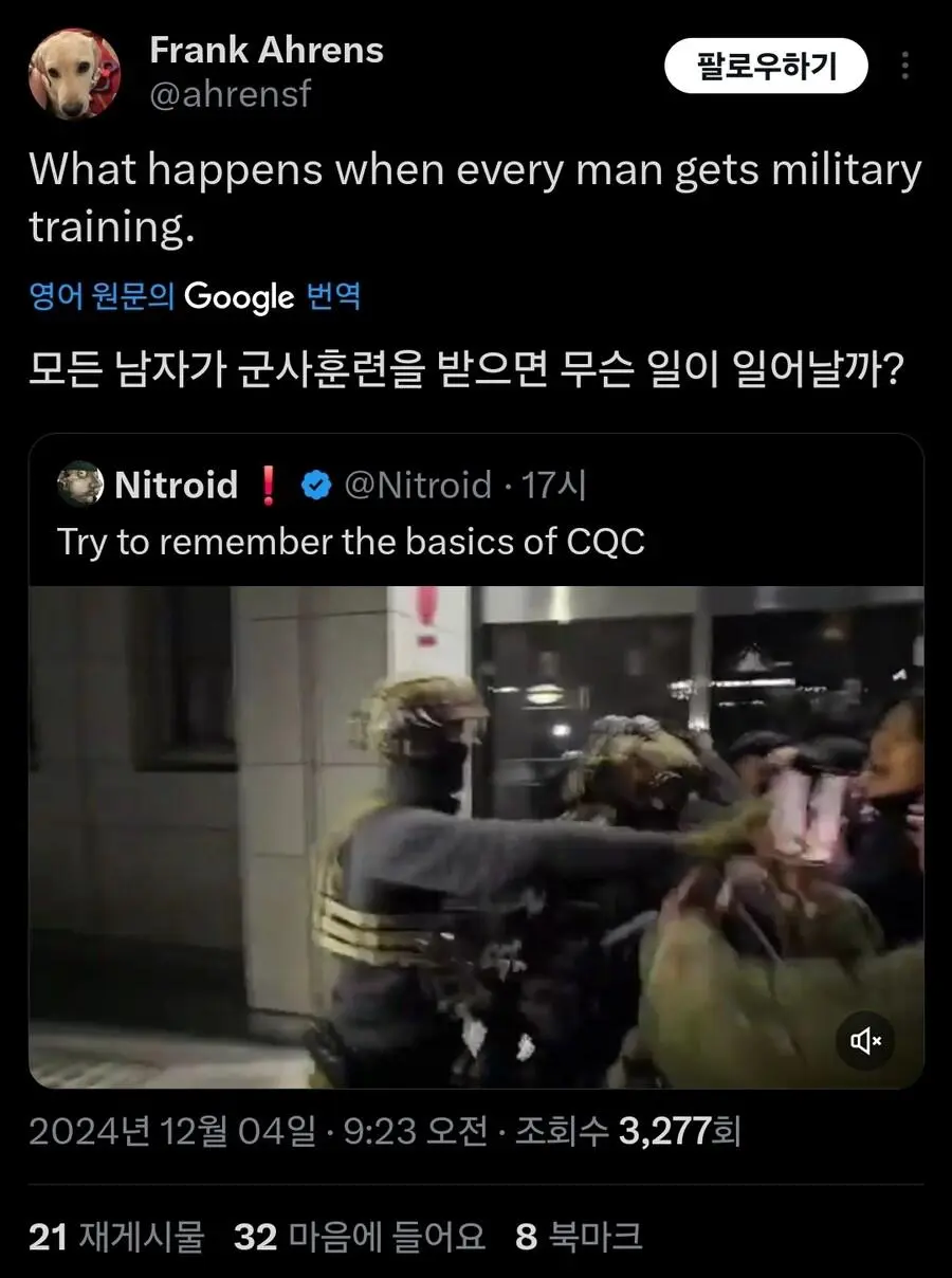 현재 외국에서 큰 화제가 되고 있는 기자의 군인 무력화 영상.mp4 웃는남자 (175.♡.37.12) 7 2465 2 0 2024.12.05 22:07 2 이전글 : 비비지 은하 만두머리 다음글 : 요즘 10대들에게 무섭게 퍼지고 있는 병.twt