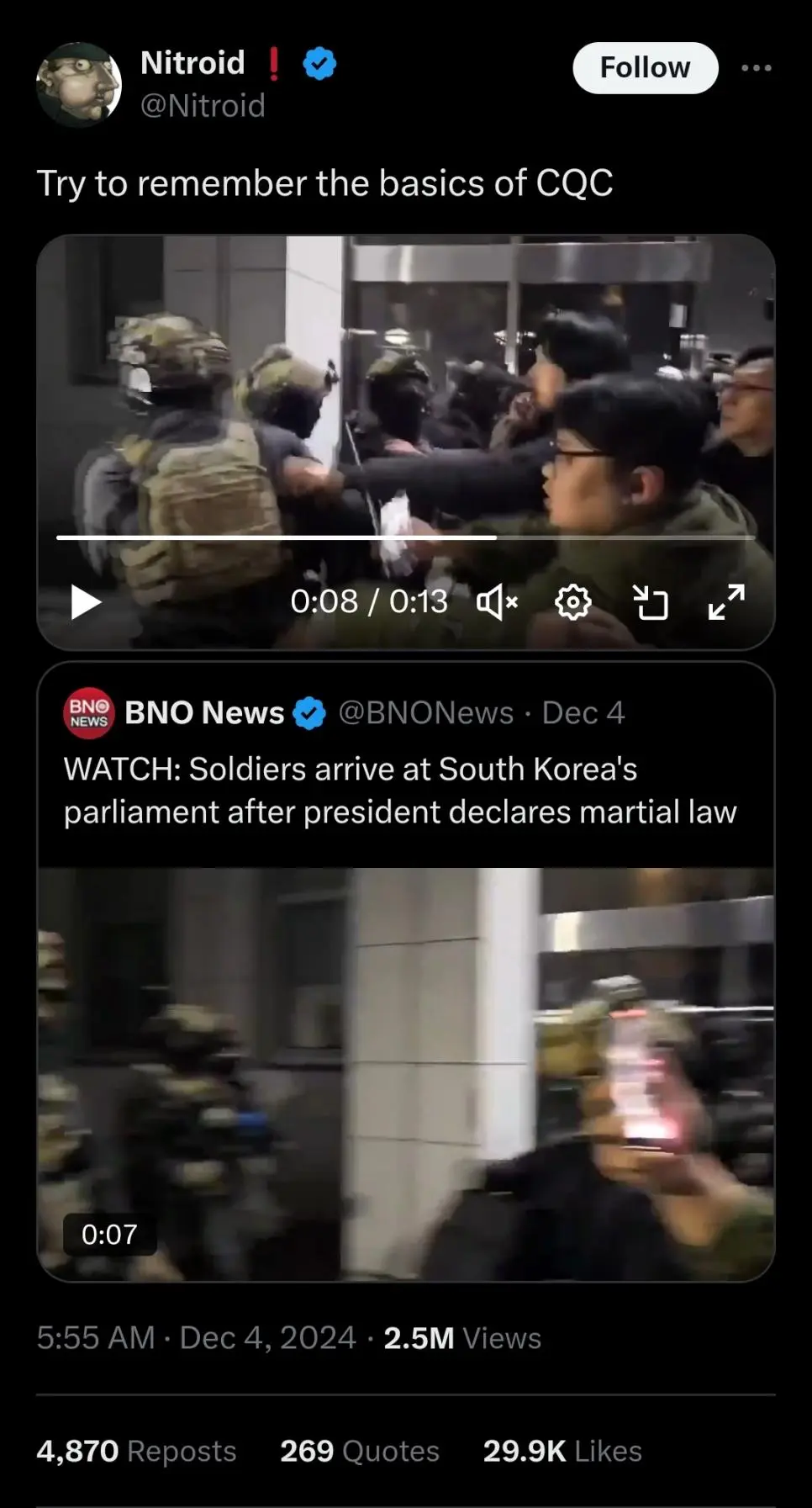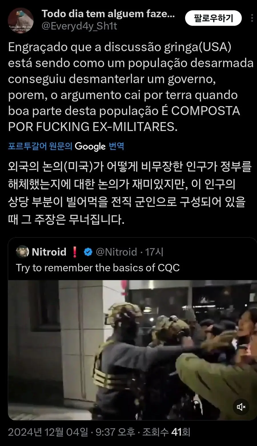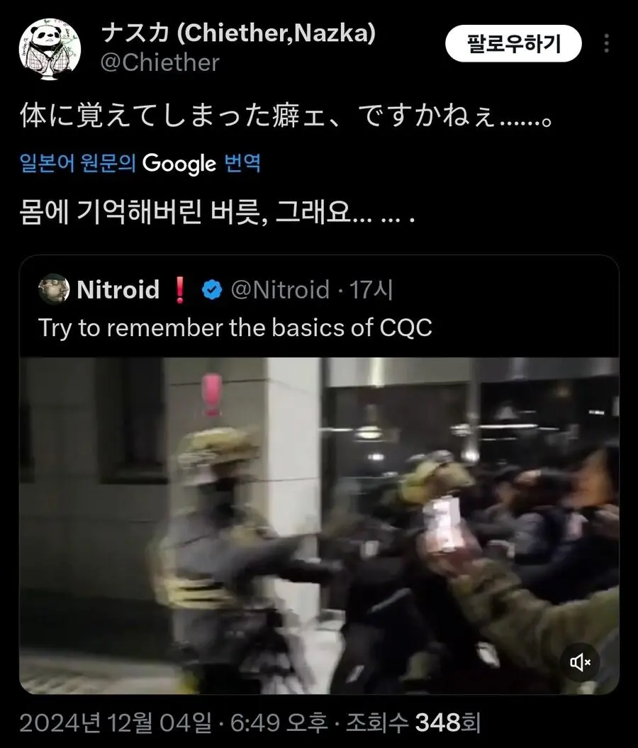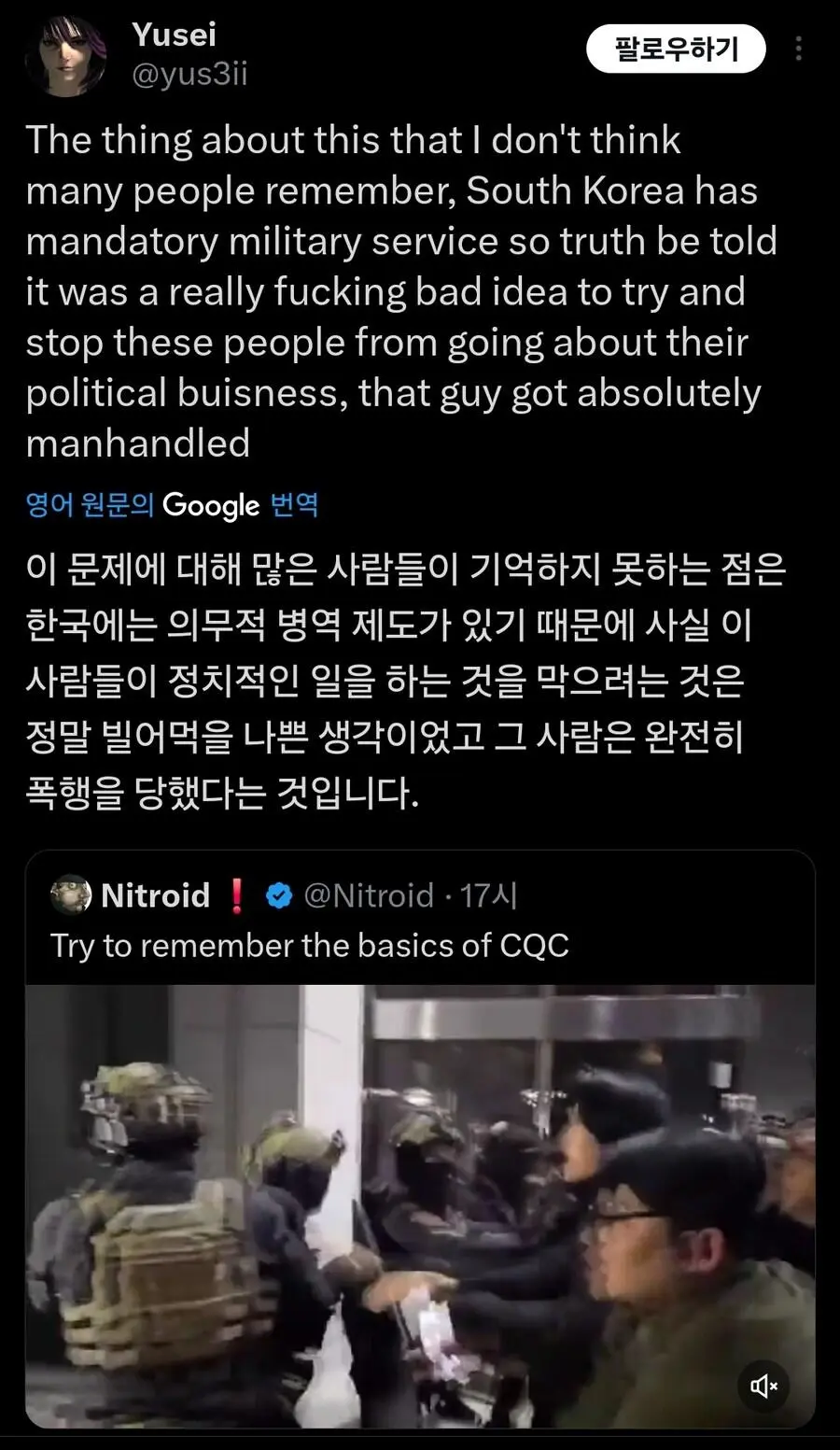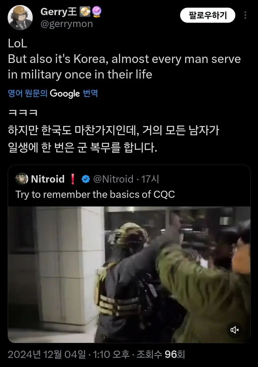 현재 외국에서 큰 화제가 되고 있는 기자의 군인 무력화 영상.mp4 웃는남자 (175.♡.37.12) 7 2465 2 0 2024.12.05 22:07 2 이전글 : 비비지 은하 만두머리 다음글 : 요즘 10대들에게 무섭게 퍼지고 있는 병.twt