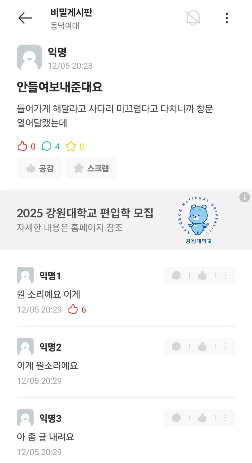 지금 동덕여대에서 벌어진 사건 요약.png 웃는남자 (175.♡.37.12) 10 4751 13 0 2024.12.05 22:00 학생들이 본관 침입하겠다고 사다리타고 2층 올라감 못내려와서 119 부름 ㅠㅠㅠㅠ 2층 창문 상황임 ㅠㅠ 소리 ON "사다리 타고 올라오면 들어갈 수 있다면서요 왜 안열어줘요 ㅠㅠ 무서워서 다시 사다리 타고 못내려가겠으니까 문열어달라구요 내가 계단으로 내려가겠다구요 ㅠㅠㅠㅠ 내가 뭐 점거를 한데 뭘한데 문열어줘요 ㅠㅠㅠ" 13 이전글 : 요즘 10대들에게 무섭게 퍼지고 있는 병.twt 다음글 : 최근 데뷔한 신예 권희원 치어리더