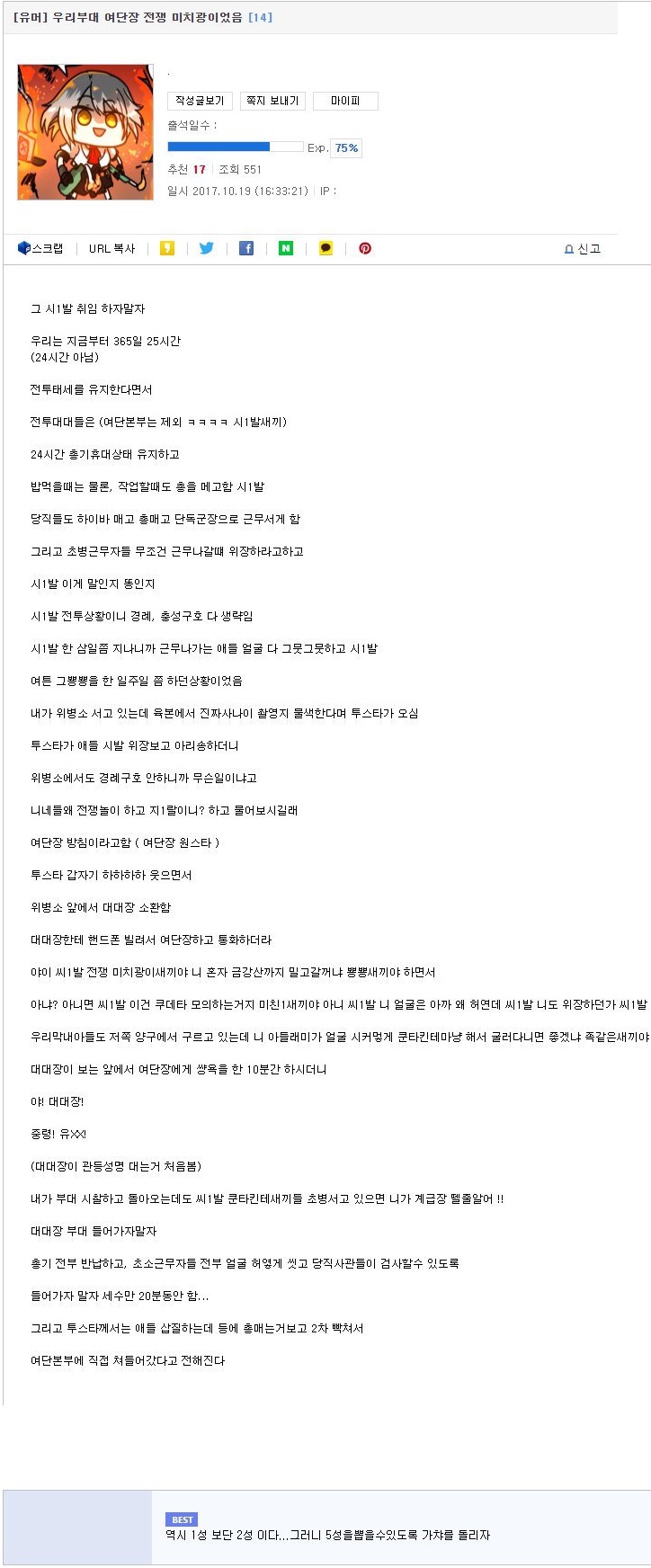진급 앞두고 저런 미친짓 했지 그러다 호국훈련때 북에서 연평도 폭격 터졌을 때 대대장 초소 근무서고 있었는데 껄껄 웃으면서 했던 말이 아직도 잊혀지지가 않는다 "이 개#끼들 이 참에 전쟁 일으켜서 싹다 죽이러 진격해야 돼!!" 그러다 호국훈련 끝나고 툭하면 국지도발,전준태 실행하고 총매고 단독 군장차고 댕기게 하고 진급 실패하고 새로운 대대장이 왔는데 전투력 강화 촉진 시행 한다며 매주 금요일 완정군장 구보를 간부고 병사고 주임원사고 나발이고 빠짐없이 뺑뺑이 돌렸지 그 새끼도 미친새끼였음 내 포상휴가도 짜른 개생키 아오 씨발 글 쓰다 떠올라서 빡치네