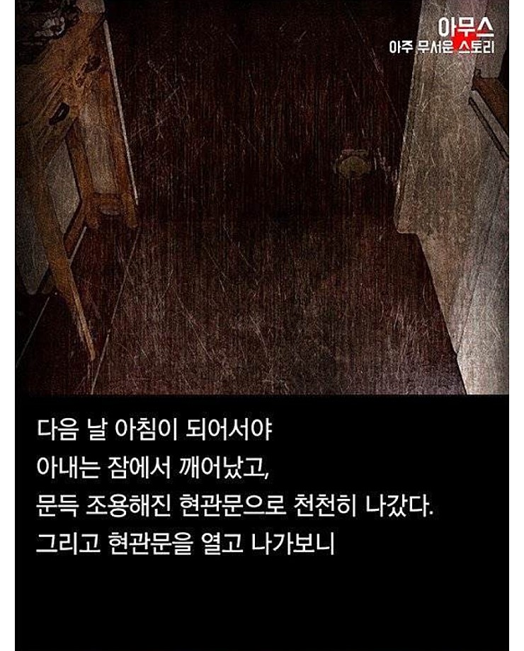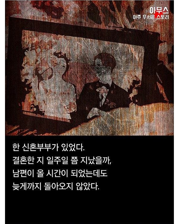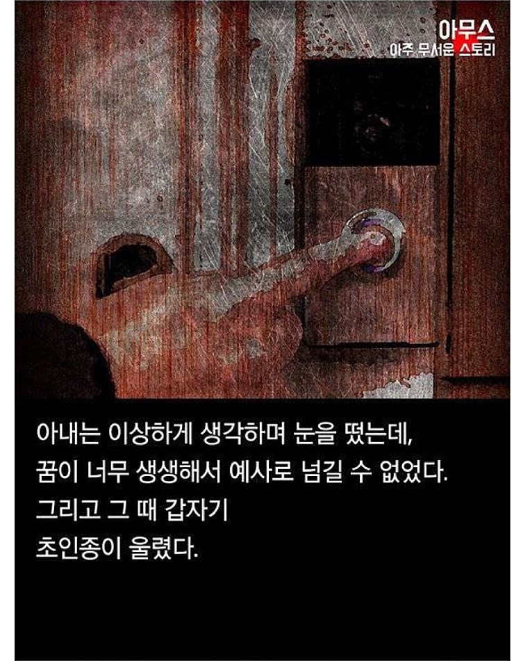 위에는 신혼이라고 나와있지만 다른 이야기는 또 중년 부부로 나오고 위에는 꿈에서 열어주지마라고 나오지만 또다른 이야기엔 내가 열쇠로 열고 올테니 초인종 눌러도 열어주지 마라는 스토리도 있고...