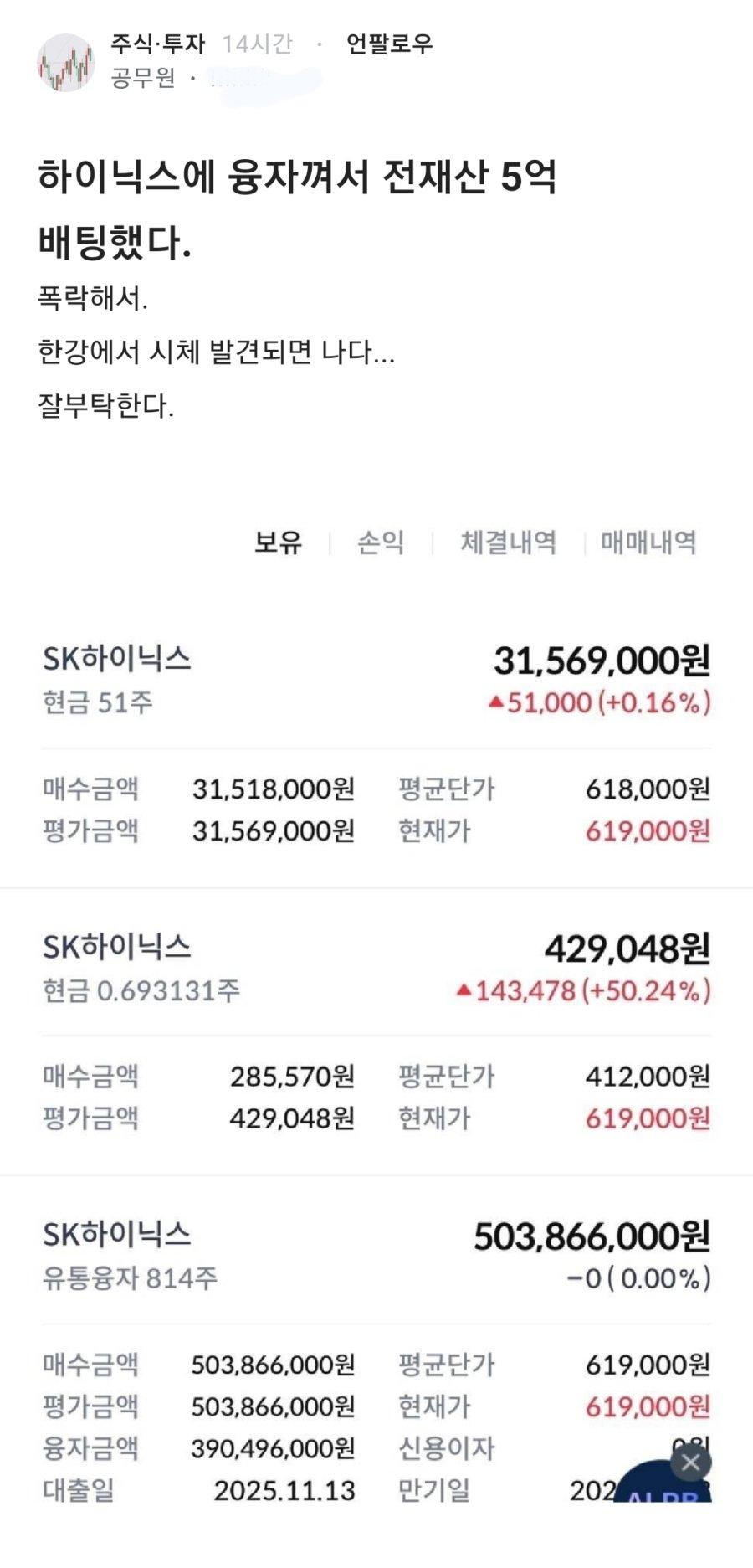 SK하이닉스 악재 웃는남자 (175.♡.37.12) 유머 9 3940 12 0 3시간전 아무리 불장이라도 공무원 조차 빚투 한다는 소리 나오면조정이 나올 것 같은데 큰일 입니다. 12 이전글 : 로드뷰에 찍힌 일본 양아치의 만행.jpg 다음글 : 카톡 업데이트 안하면 메시지 내용도 못보게 바뀜.JPG