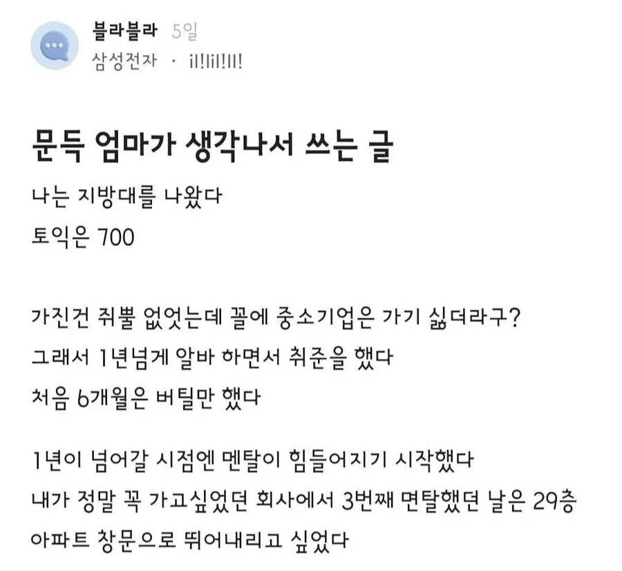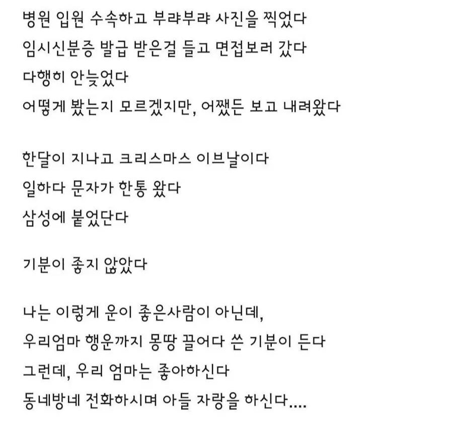 삼성에 취업한 어느 블라인의 글.jpg 불량우유 (110.♡.201.27) 유머 6 6799 33 0 12.28 23:18 ㅠㅠ 33 이전글 : 남편이 세 번 이상 할 수 있는 이유 다음글 : 프로미스나인 이나경