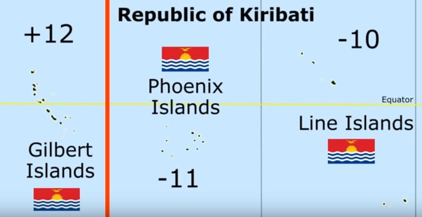 키리바시와 하와이는 비슷한 경도에 있는데도 하와이에서 월요일이면 키리바시는 화요일로 하루차이가 나.